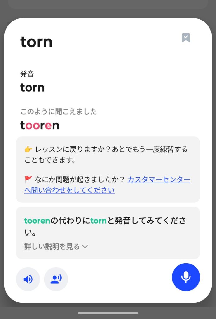 Speakは単語だけを練習できるので、私もtornのみ発音練習をしてみましたが、見事完敗。